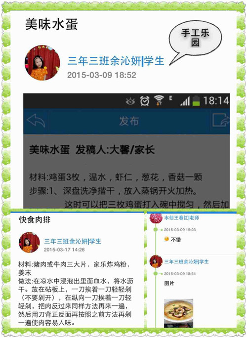 4、手工乐园。利用余沁妍妈妈和面点手艺突出的姥姥,推出家庭巧手制作的东西,指导学生或家长做些简单易学的食物,面艺等。