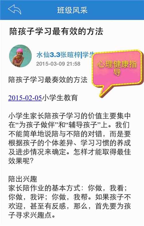 6、小学生心理健康指导。由班级张暄梓家长和王卓彤家长负责,推送一些小学生心理指导的建议、以及8、9岁孩子的心理问题等。结合我们学生年龄特点的。