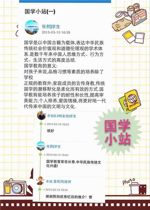 7、国学小站。班级中张熙同学每周在白云书院学习国学(坚持学习了两年)所以张熙妈妈推出的是国学方面的指导,绝对正能量的东西。