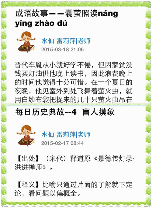 我呢,依旧是隔几日推送一篇历史典故或成语故事,适合3年级学生的,不要深奥,浅显易懂,有教育意义的小篇目,每篇后面都有成长心语。(之前发的没人看,看了匆匆过,到现在有表达有交流,有体会)